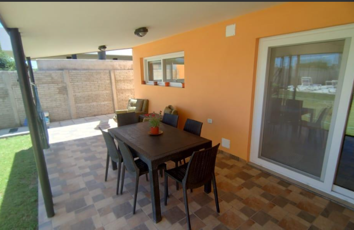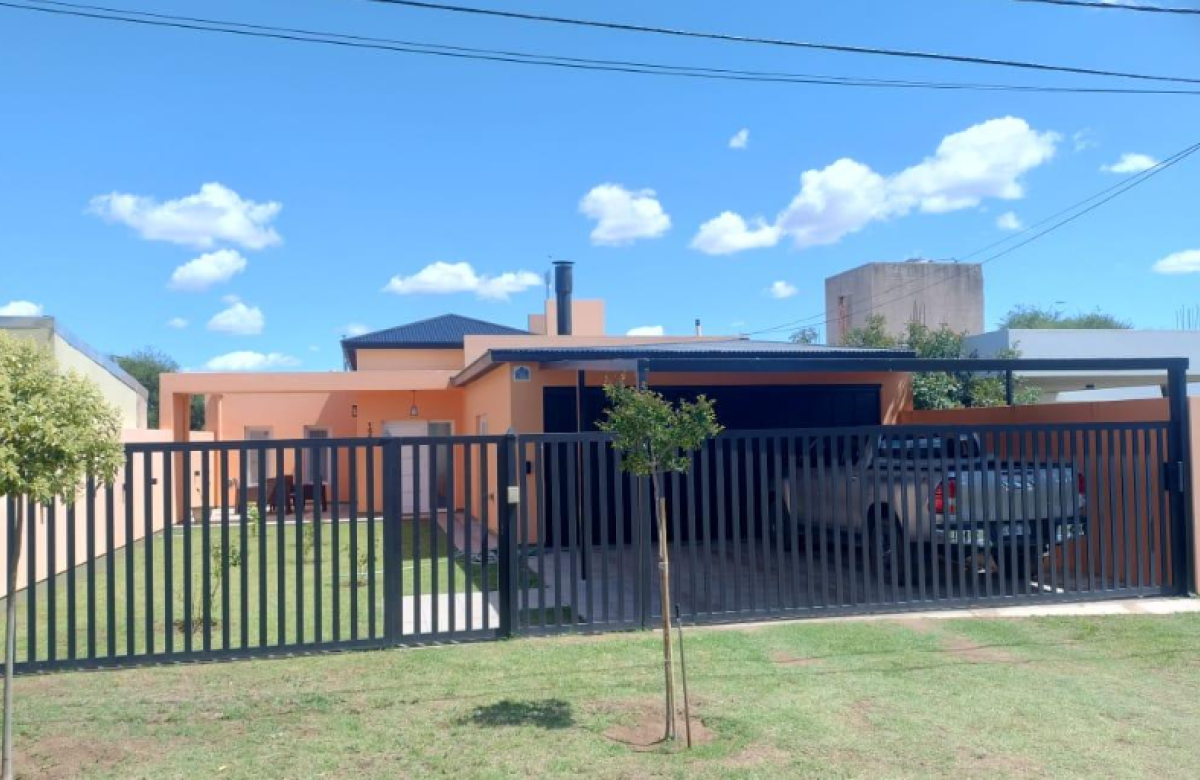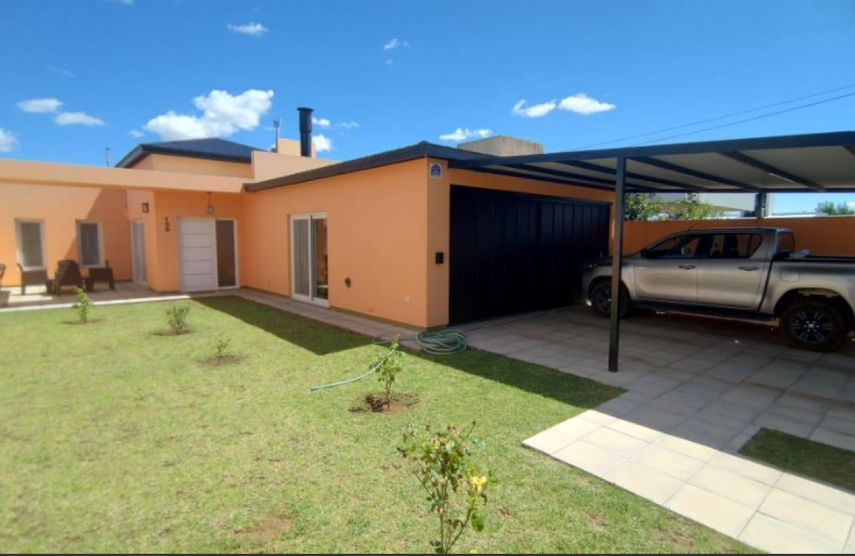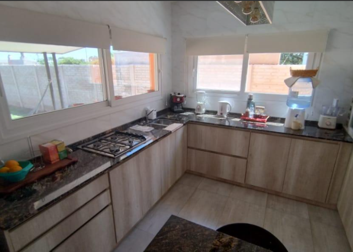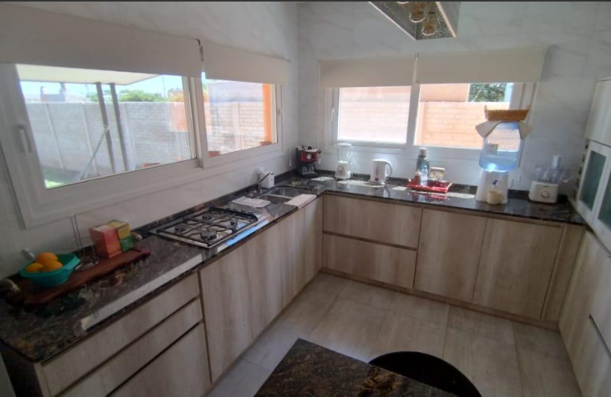 El inmueble cuenta con dos dormitorios, tres baños, living, cocina comedor, garage/quincho con parrilla, cochera para dos autos, patio con pileta y jardín parquizado.